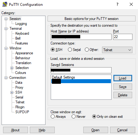 - Open PuTTY, in the “Category” pane go to “Session” and enter your domain host name and port.