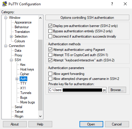 - Then go to the section Connection -> SSH -> AUTH and upload your private key file for authentication.