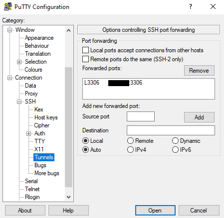 - To setup the tunnel, go to SSH -> Tunnels and enter your local port to forward to and remote address as destination.