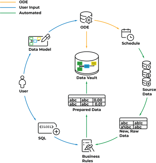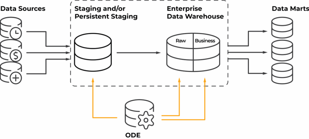 ODE helps you build a modern, agile data warehouse with minimal cost. ODE is an orchestration engine that stores your Data Vault metadata, executes custom-written ETL stored procedures or simple generated SSIS packages and loads the data on schedule.