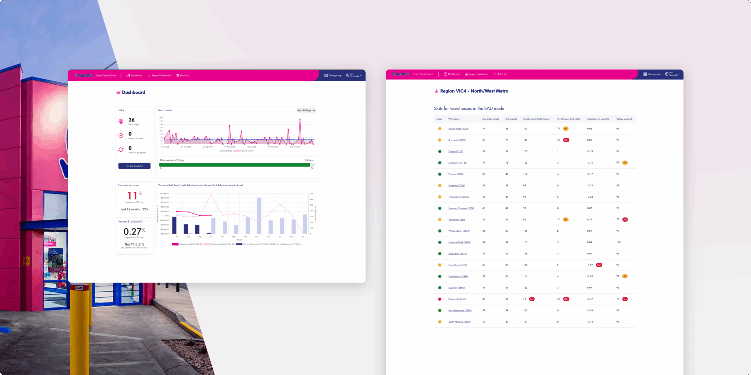 Each branch gets a live dashboard showing how many items have been counted, how that compares to the target, and where variances have occurred. Regional dashboards give area managers a full view of how their branches are performing.